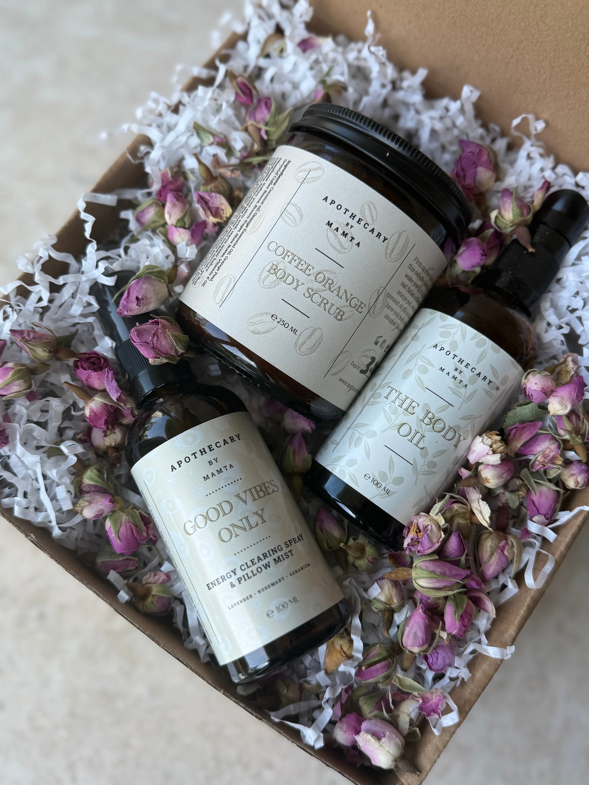 A self care gift for your bestie, this package includes our signature body scrub, body oil, and good vibes only energy clearing spray.